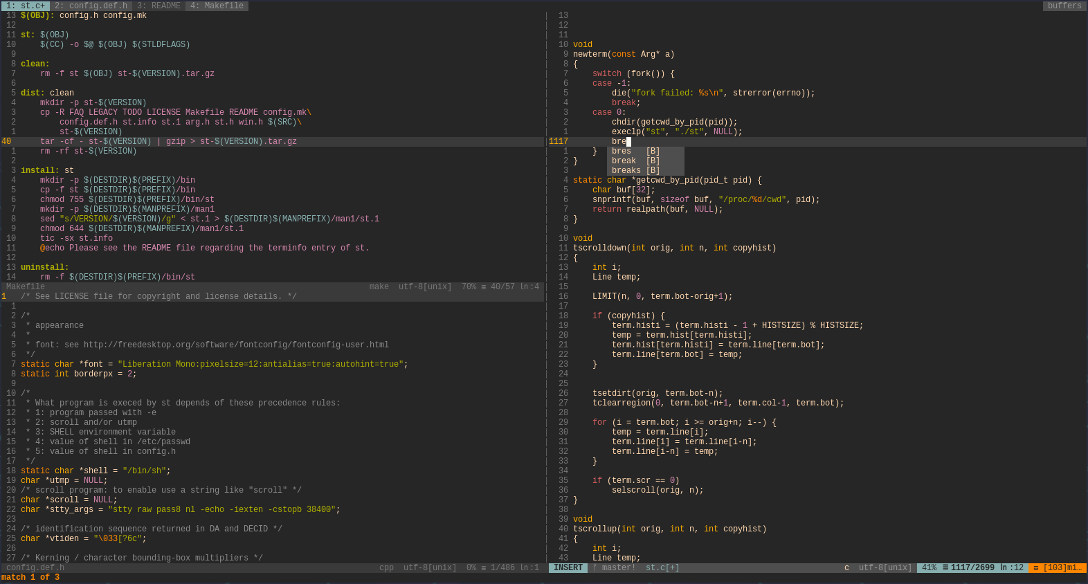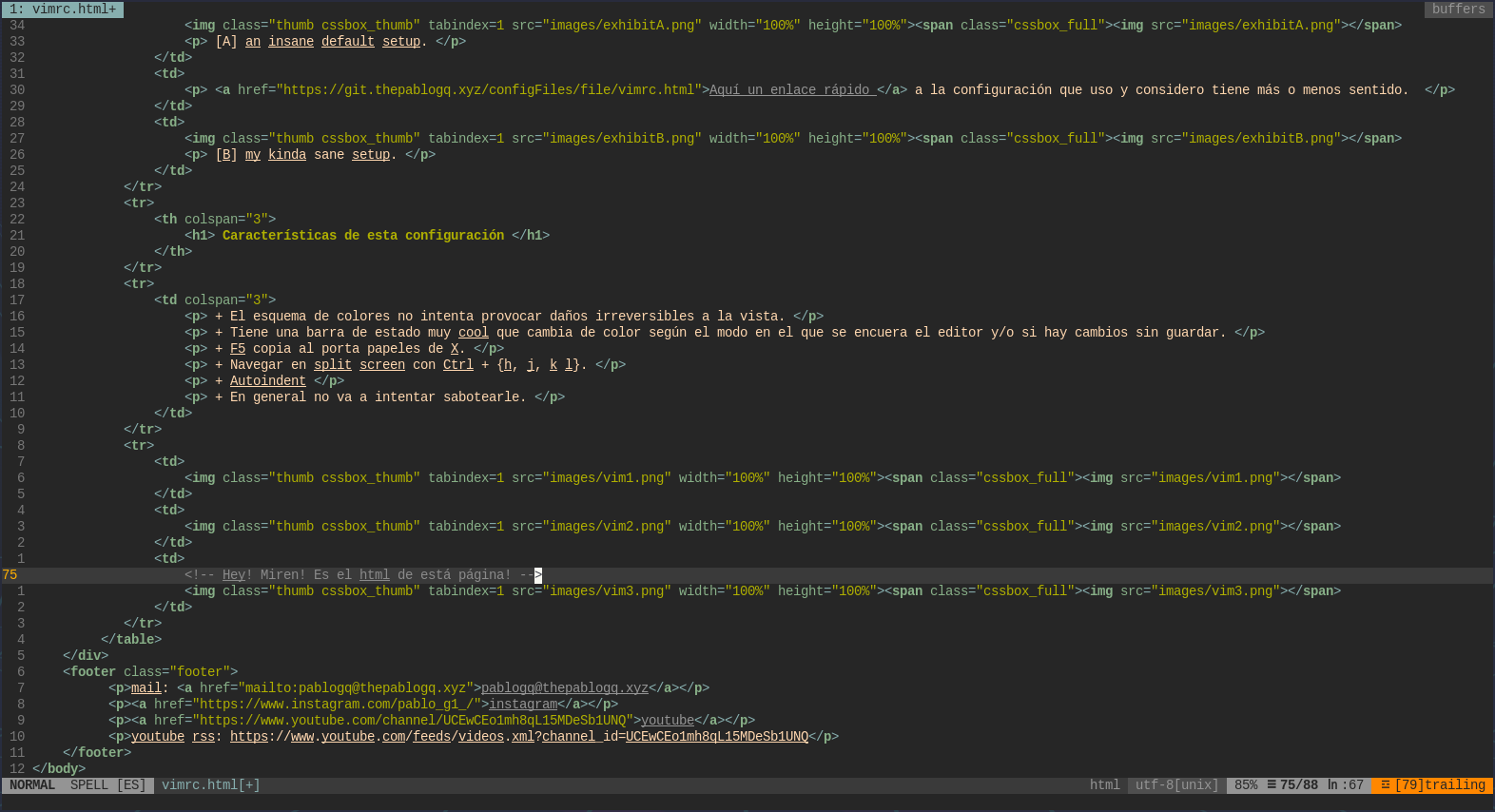 + El esquema de colores no intenta provocar daños irreversibles a la vista. + Tiene una barra de estado muy cool que cambia de color según el modo en el que se encuera el editor y/o si hay cambios sin guardar. + F5 copia al porta papeles de X. + Navegar en split screen con Ctrl + {h, j, k l}. + Autoindent + En general no va a intentar sabotearle. |